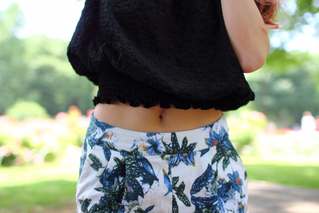ヘソだしのトップスにスキニー